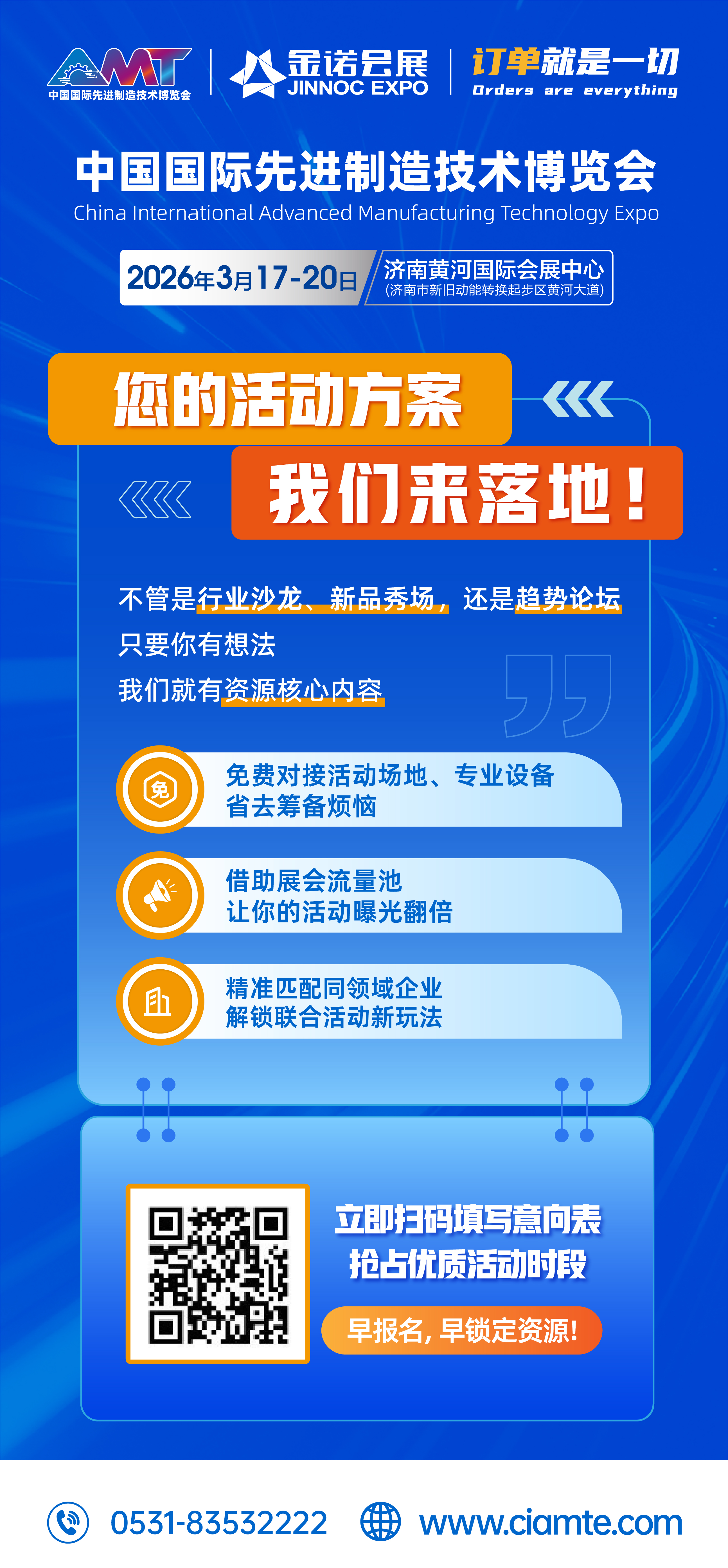 扫描下方二维码,填写《2026中国国际先进制造技术博览会企业活动报名表》,优先锁定展会期间优质活动时段!早报名可优先选择靠近核心展区的活动场地,曝光效果翻倍!