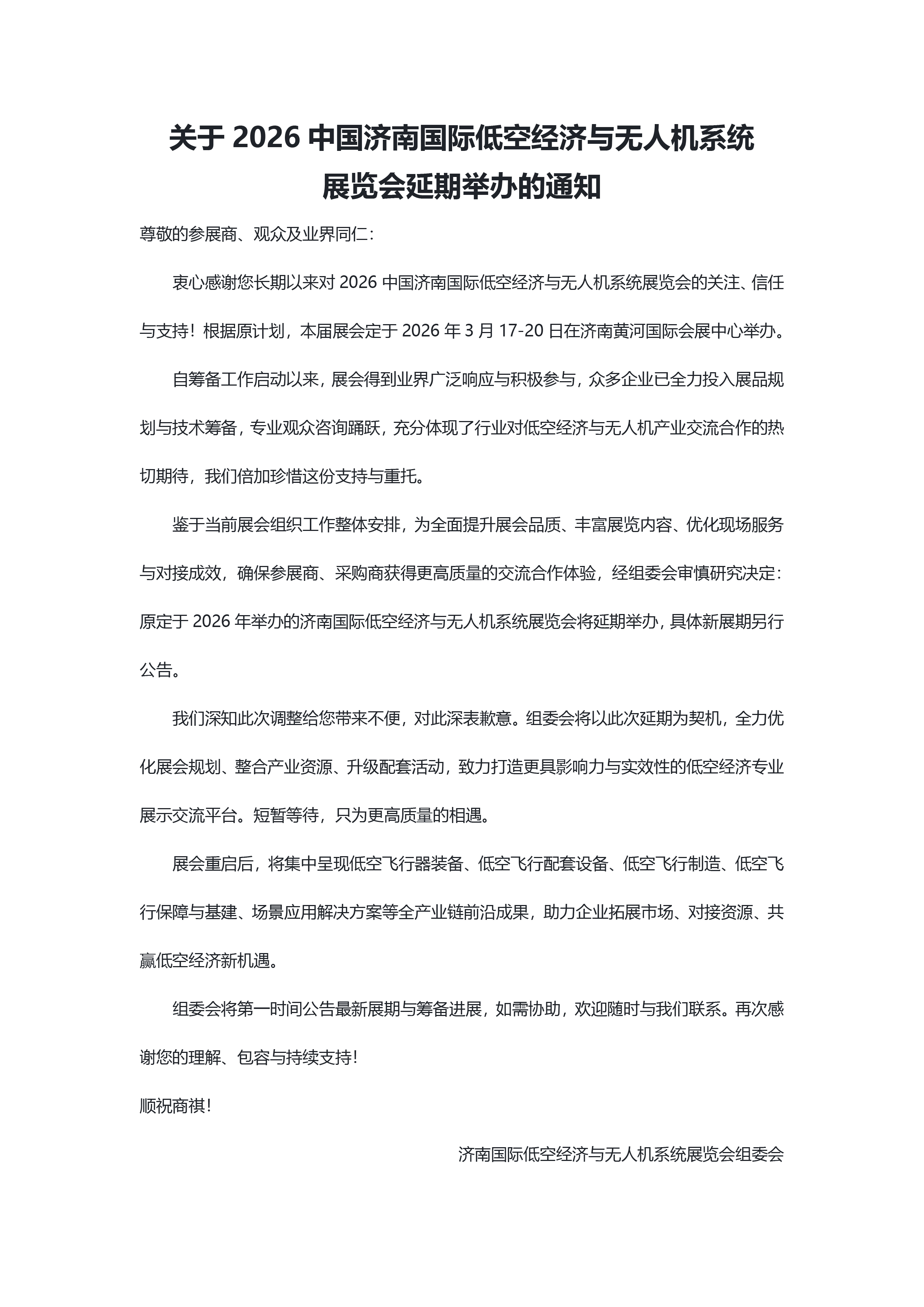 关于2026中国济南国际低空经济与无人机系统 展览会延期举办的通知